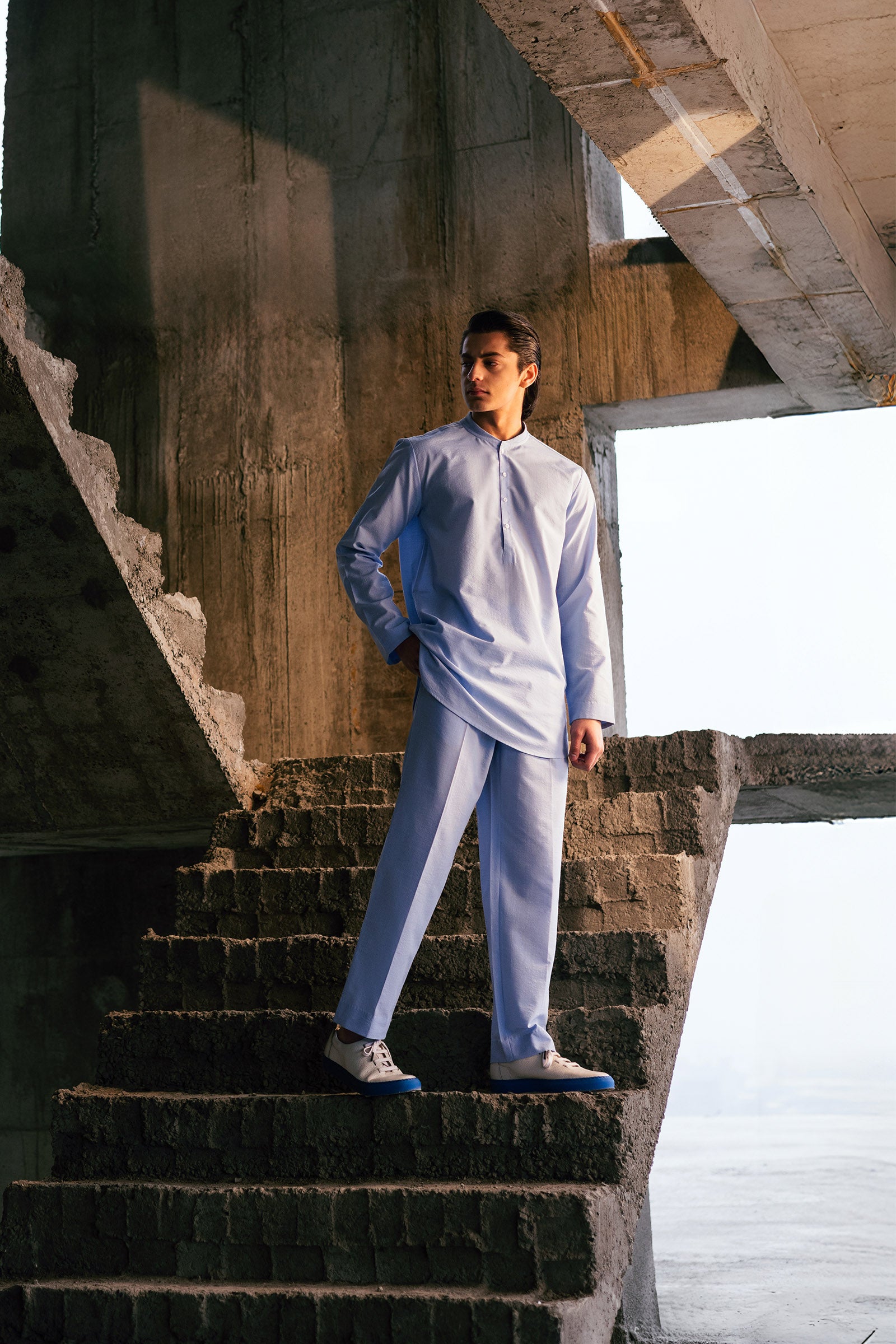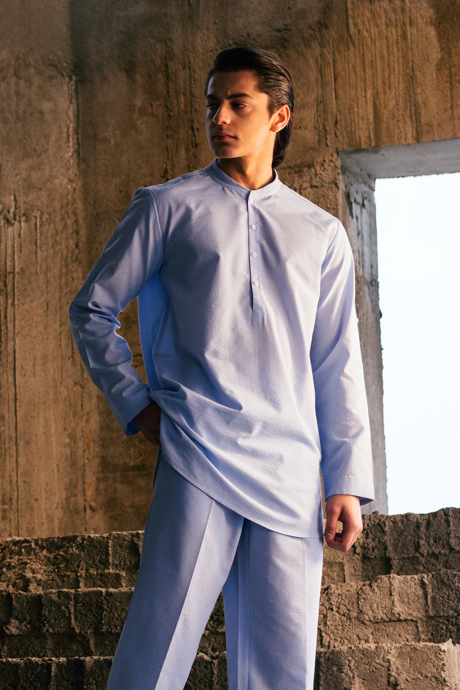 Experience contemporary style with this unique crushed fabric shirt. Featuring a modern silhouette, ribbed collar, and overlapped placket, it's paired with comfortable regular pants for a refined yet relaxed look.